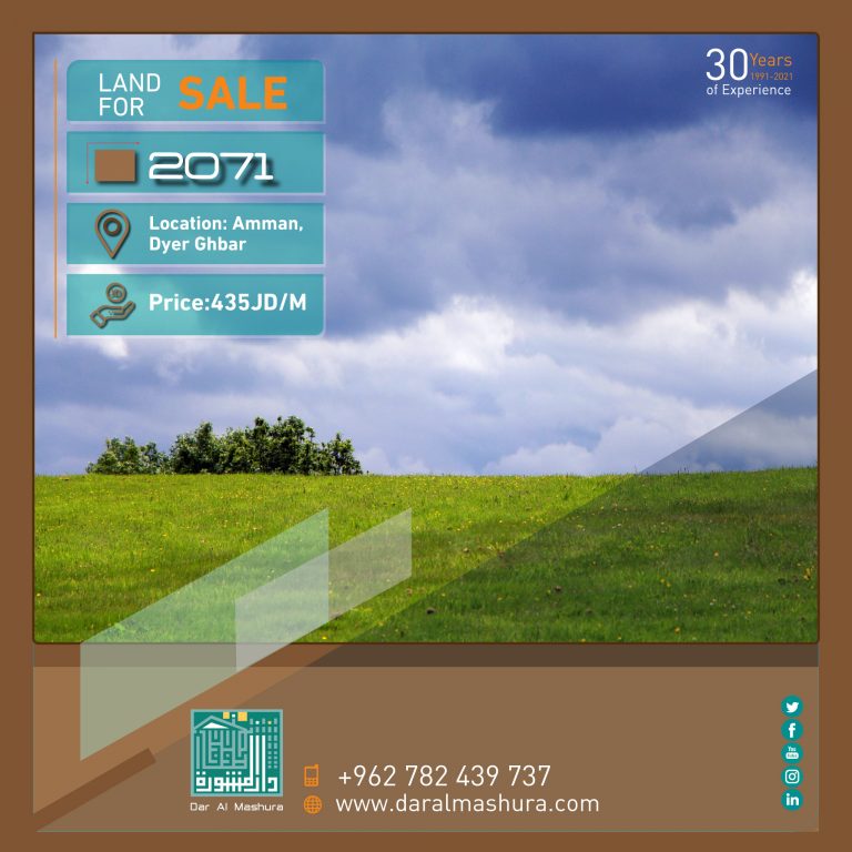 مساحة الارض: 2071 متر – سعر المتر 435 دينار