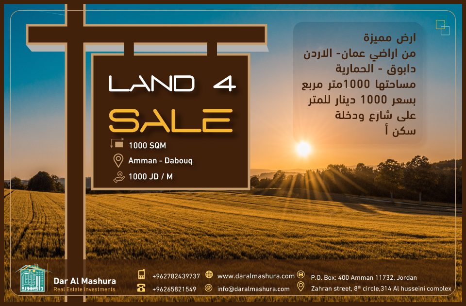 ارض مميزة للبيع – عمان – دابوق دابوق, حزام غرة, دابوق وصف العقار ارض مميزة وبسعر مميز عمان – دابوق المساحة 1987 متر حوض حزام غرة لمزيد من المعلومات ابو وسام 0798668506 مشاركة : تواصل مع المالك الإسم الكامل* بريدك الالكتروني* رسالتك* إرسال رسالة خاصة عقارات متشابهة للبيع1,000 دينارللبيع1,000 دينارللبيع2,000 دينار