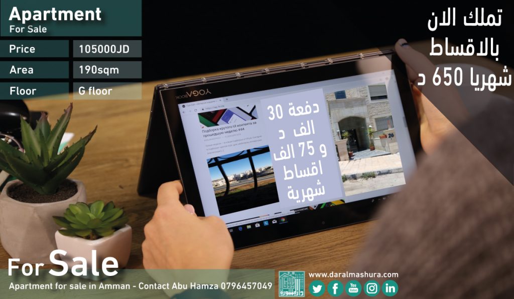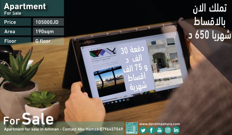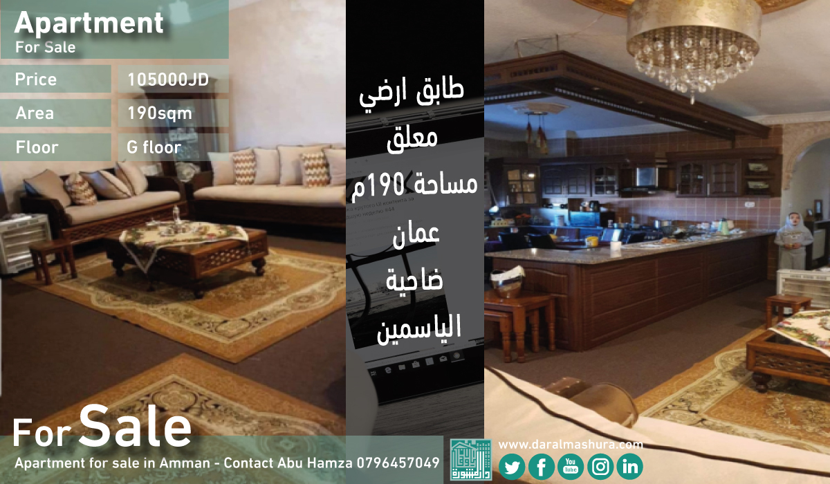 ارضي معلق .. مساحتها 190 متر .. فيها تدفئه على الغاز الطبيعي.. اباجوارات كهرباء .. حمايه لكل البيت .. سيراميك ..مطبخ امريكي كبير .. 3 نوم وحده ماستر .. غرفة ضيوف منفصله مع حمام.. 8 متر ماء مع مضخه ..