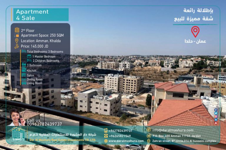 شقة بإطلالة رائعه للبيع في عمان – خلدا 250 متر