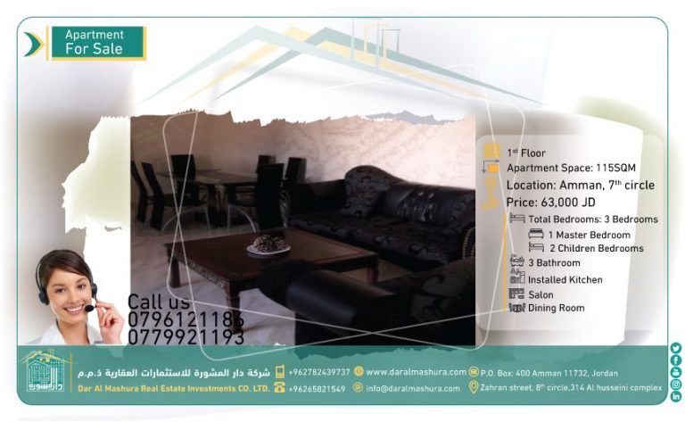 مساحة الشقة: 115 متر – الطابق الاول