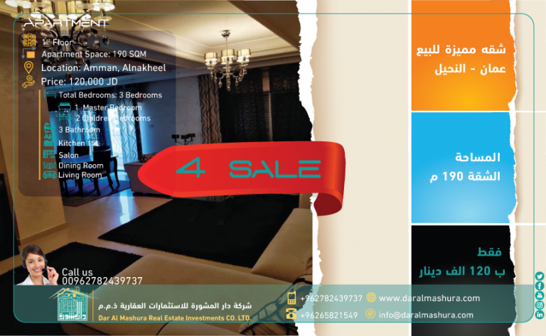 شقة مفروشة مساحة 190 متر بسعر 120 الف دينار للبيع في عمان ضاحية النخيل