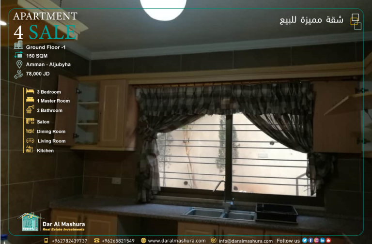 مساحة الشقة: 150 متر– طابق شبه ارضي