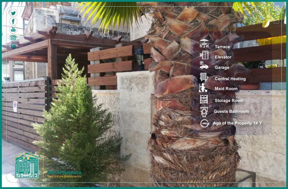 مستودع – غرفة خادمة – كراج لسيارتين – بئر ماء 9 متر – مصعد – سخان شمسي