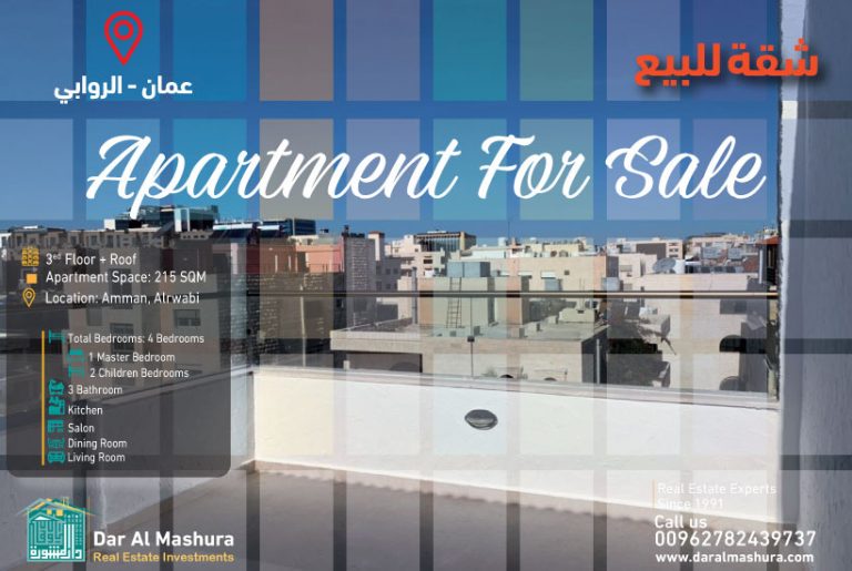 شقة مميزة طابق ثالث مع روف للبيع – عمان حي الروابي