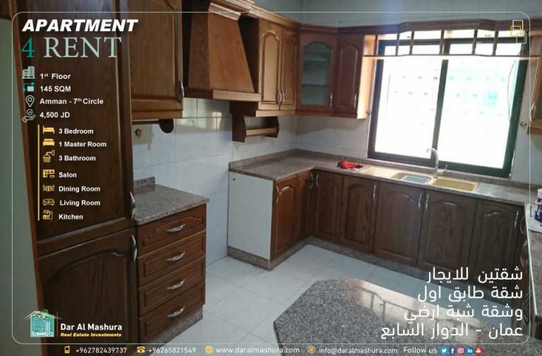 الإيجار السنوي : 4,500 دينار اردني الطابق الاول – و 4,000 دينار اردني للشقق شبه الارضي