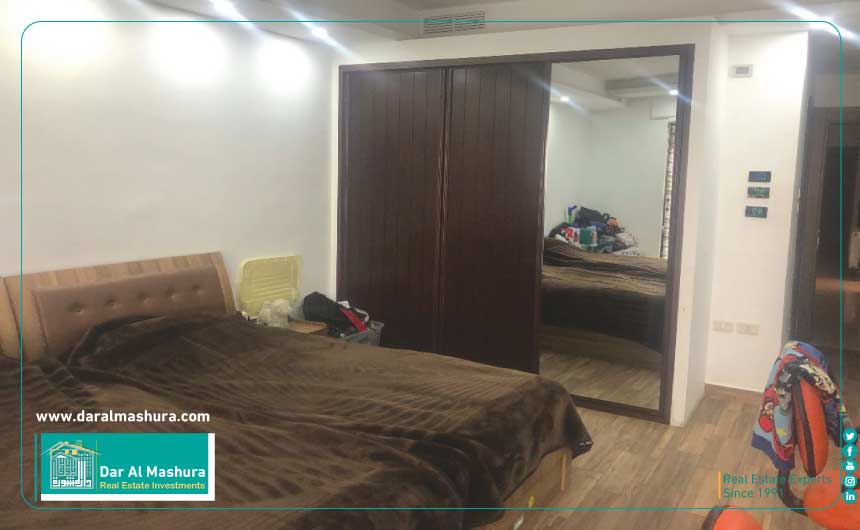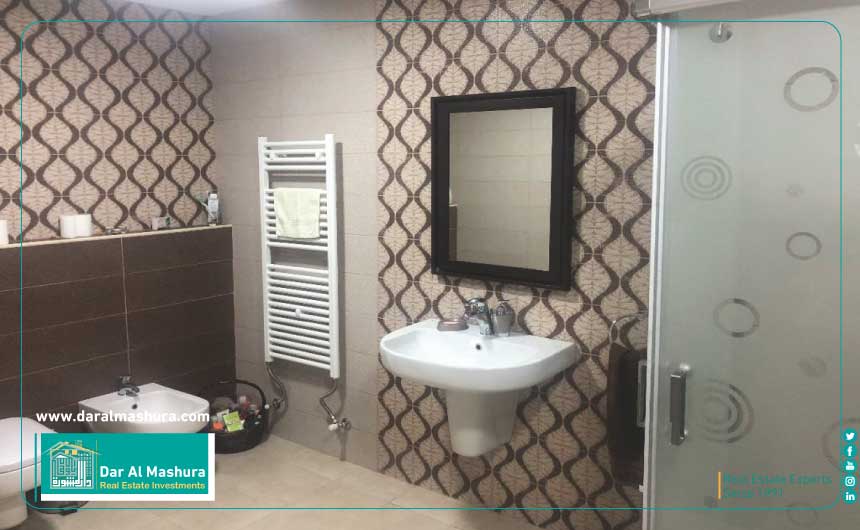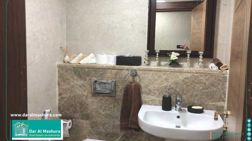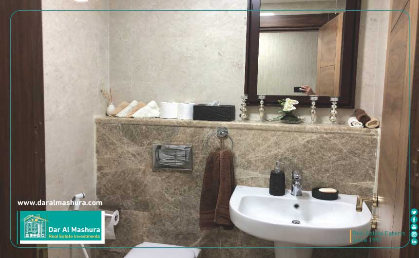 • ارضيات رخام مزخرف في المدخل والصالون والسفرة وحمام الضيوف، وسيراميك كبير بالجلوس والمطبخ، سيراميك باركيه في غرف النوم.