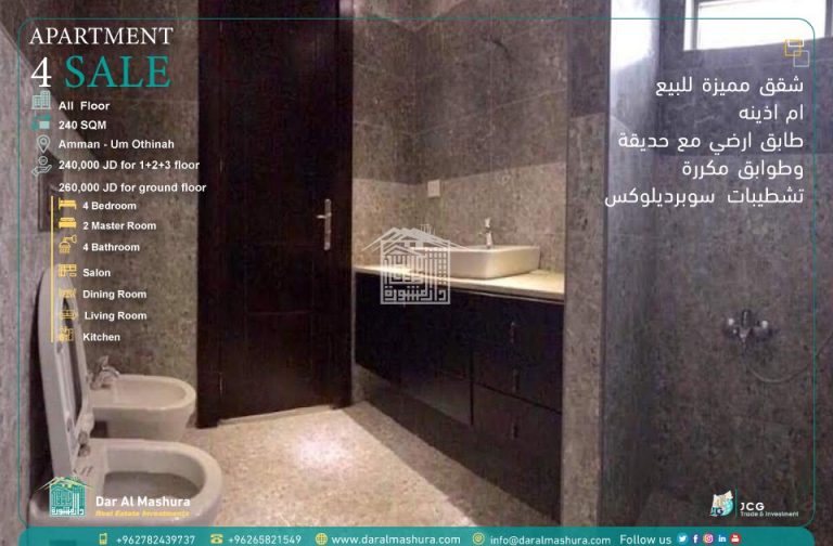 السعر : 240,000 دينار اردني الطوابق المكررة – وبسعر 260,000 دينار اردني الطابق الارضي